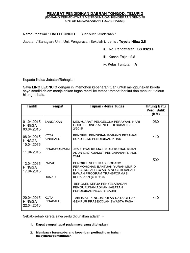 Borang Kebenaran Menggunakan Kenderaan Sendiri Kpm / Of articles of association bersama borang 24 & 49.. Cara menghitung pajak kendaraan, tarif progresifnya dan aturan lapor spt pajaknya. Download borang kebenaran menggunakan kenderaan. Berikan alasan yang jelas sebab permohonan pergerakan. Utama » bantuan 2021 » semakan bpn 2.0 bujang: Sementara orang lain yang pernah dibohongi akan merasa kecewa dan sakit hati.