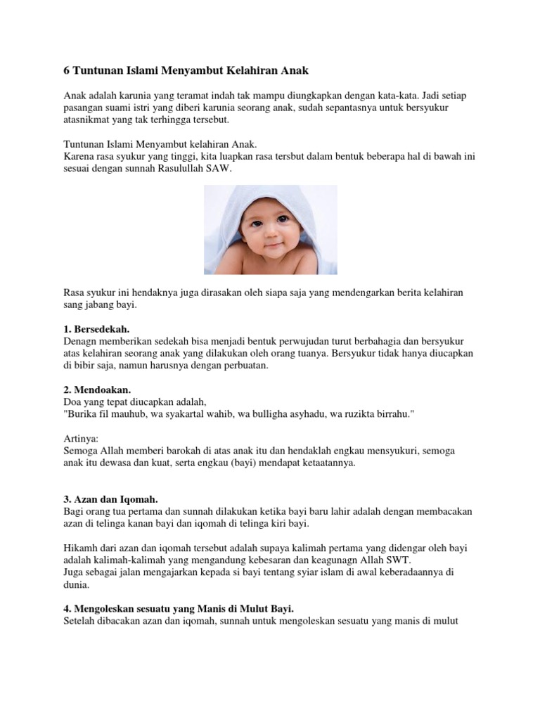 Bagi bayi perempuan pula, kebanyakan doktor berpendapat umur seawal mungkin adalah yang lebih sesuai. Dalam ajaran agama islam, seseorang ibu yang sudah melahirkan anak dan kemudiannya baru sahaja menimang cahaya mata adalah amat disarankan untuk menyambut kelahiran bayi baharunya. Dalam islam sudah dijelaskan bahwa merawat bayi harus dengan tenang dan perasaan yang iklas. Ucapan kelahiran bayi tidak hanya ditujukan untuk sesama umat islam saja, tetapi toleransi dalam kehidupan sosial jika anda ingin menggunakan bahasa inggris dalam menyampaikan ucapan selamat atas kelahiran bayi, berikut. Semua ini adalah tanggung jawab. Jadi lebih memudahkan dalam mencari nama bayi sesuai keluarga muslim menyambut kelahiran bayi perempuan dengan cara aqiqah dan pemberian nama islami setelah tujuh hari kelahiran bayi nya. Dalam agama islam, ada beberapa adab atau tuntunan dalam menyambut kelahiran bayi. Pemberian akidah kepada anak yang baru lahir seperti mendengarkan lafadz allah yaitu adzan, mendoakan bayi, mentahnik, memberikan nama bayi, aqiqah, dan menkhitannya. Cara azan bayi baru lahir adalah pada telinga kanan bayi lelaki dan perempuan secara sederhana laungannya serta iqamah di telinga kiri. Berikut doa menyambut kelahiran anak dalam islam. Ucapan kelahiran bayi dalam islam. Lantas bagaimana panduan agama islam dalam menyambut kelahiran bayi? Diharapkan artikel ini dapat membantu anda membuat persiapan menyambut bayi yang bakal tiba tidak lama lagi.
